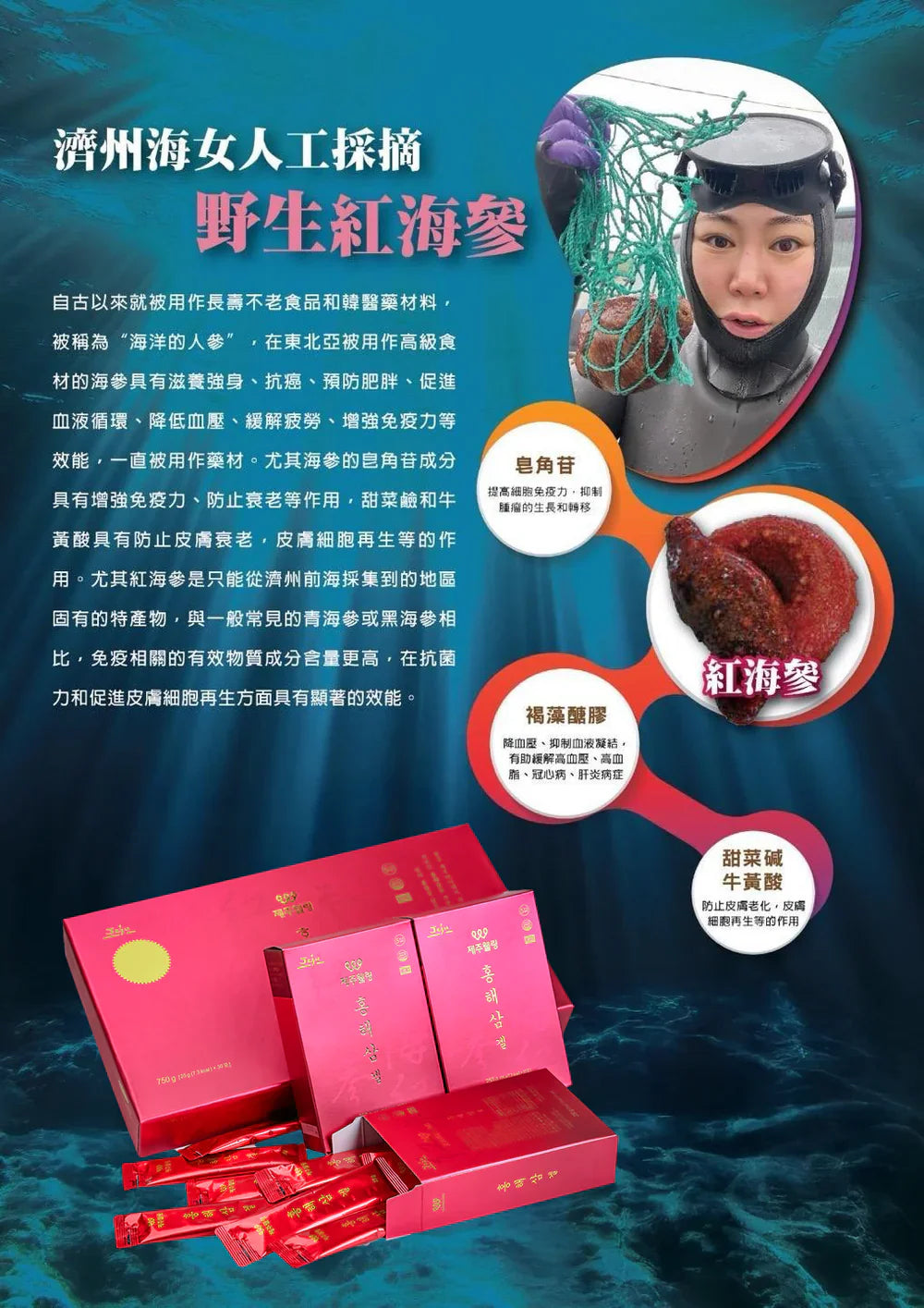 2. 韓國濟州島海女深海採集: 韓國濟州島的紅海參栖息在濟州大海深處,由被聯合國教科文組織收錄為人類非物質文化遺產的濟州海女趕海直接採取紅海參,經過專利技術提煉出高營養成分,配以少量韓國紅蔘和天然藍莓汁,製成果凍狀口服凝膠飲品,口感佳,服用方便。適合於老弱病患者、抗癌患者、生長期的兒童青少年,孕婦,中青年男性、女性等多重年齡層食用。